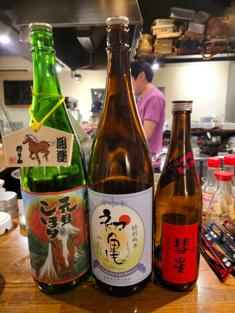 【吉祥寺 やきとんなるせ】「朝日 元旦しぼり」「初亀 特別純米 無濾過生原酒」「小夜衣 純米吟醸 彗星」